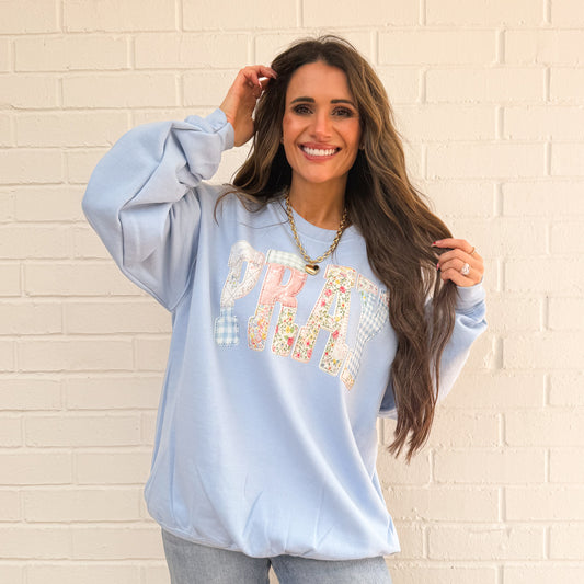 FAUX quilted Pray, Varsity Faith, Preppy Cottage core Worship, Faux Quilted Religious, Faux Embroidered Christian (NOT Real Fabric Patches) Sweatshirt
