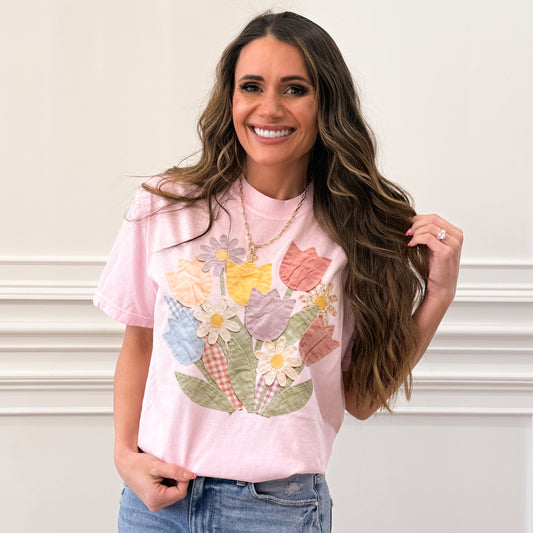 Faux Quilt Style, DTF Print, Tulips & Wildflowers Sweatshirt (NOT Real Fabric Patches) Website