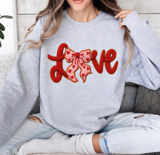 Faux Yarn Valentine's Day LOVE, Faux Knitted Yarn Texture Valentine, Crochet Coquette Bow, Pink Red Sweatshirt