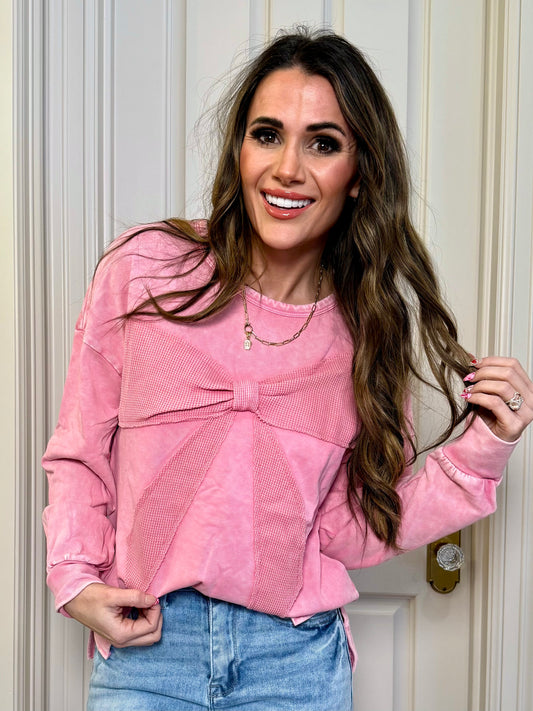 Bright Pink Mineral Wash Big Bow Patchwork Pullover Sweatshirt