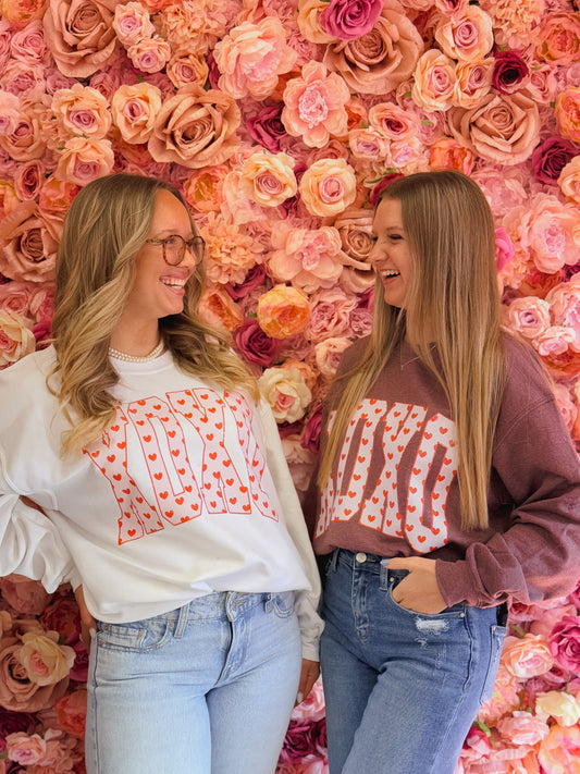 Faux Yarn Valentine's Day LOVE Heart, Stacked Letters, Faux Knitted Yarn Texture Valentine, Crochet Coquette, Pink Red Sweatshirt (Website)