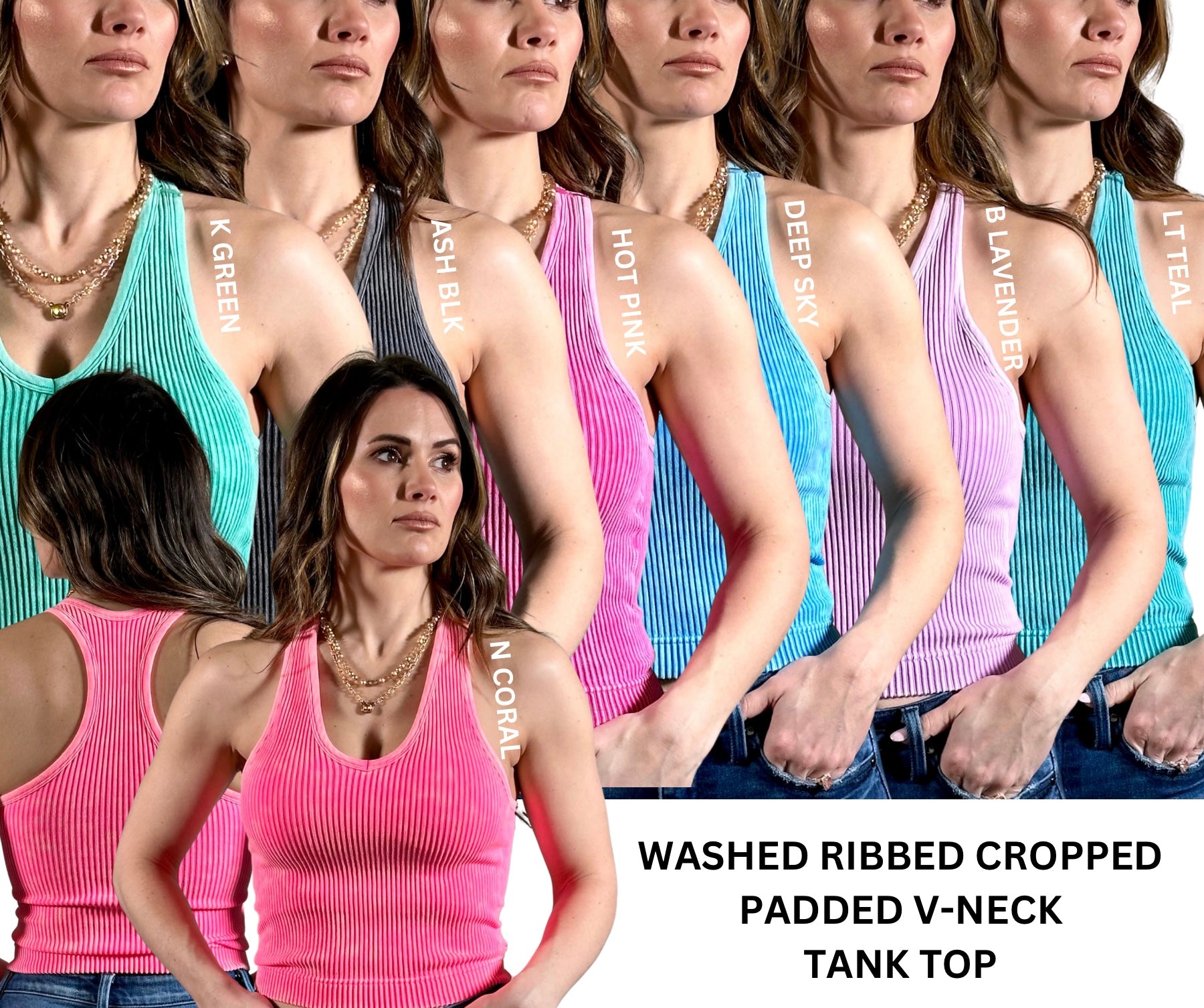 WASHED RIBBED SEAMLESS BRA PADDED V-NECK TANK TOP - REMOVABLE BRA PAD - WASHED RIBBED FABRIC - RACERBACK * Each item is unique, expect variations in color and finishing TOTAL BODY LENGTH: 17.25", BUST: 22.5" approx. - MEASURED FROM S/M ** COLOR MAY VARY SLIGHTLY DUE TO MONITOR RESOLUTION