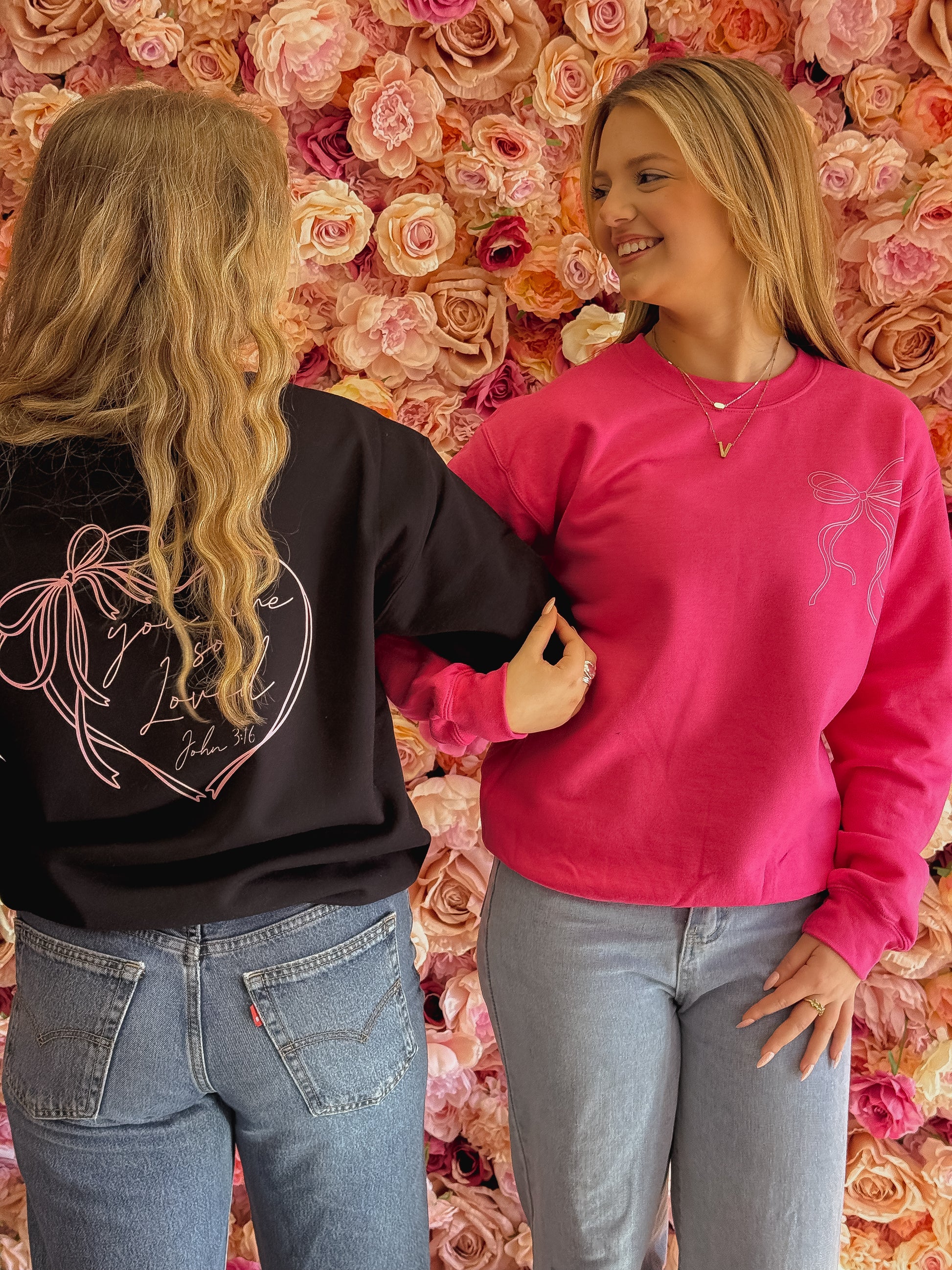 You Are So Loved Coquette Bow Front & Heart Back, Jesus Valentine, Christian Valentine, Bible Verse, Christian Coquette, John 3:16 Sweatshirt