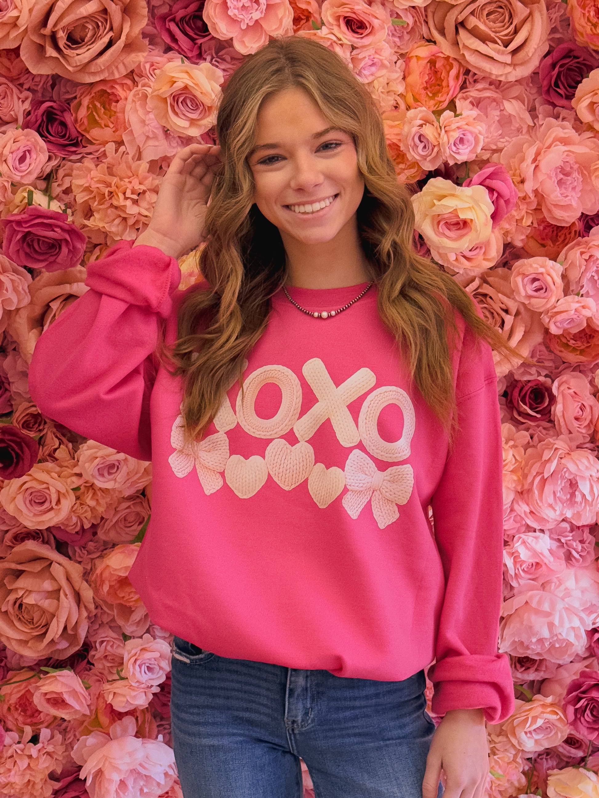XOXO Faux Yarn, Hearts, Bows, Light Pink & Cream, Faux Yarn Valentines Day Sweatshirt